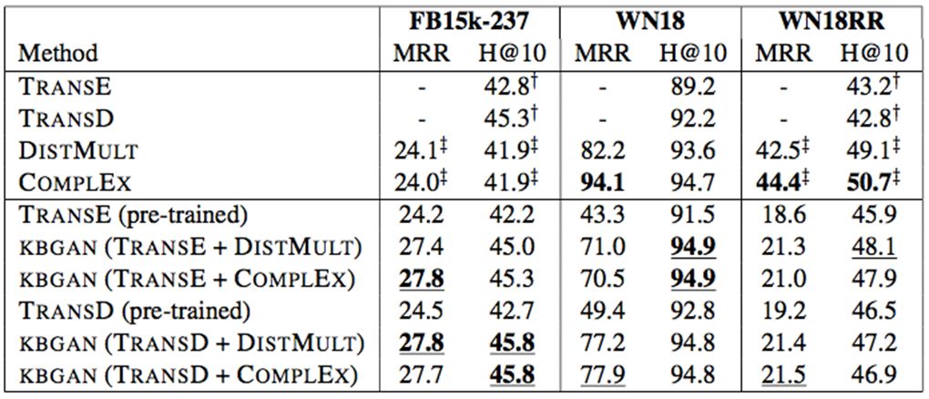 论文选用的数据集有FB15K-237, WN18, WN18RR,结果发现使用 DISMULT 或 COMPLEX 作为生成器都不会对性能有较大影响,且 TransD, TransE 在 KBGAN 中很明显优于它们的 baseline。
