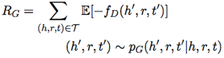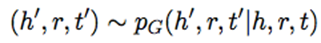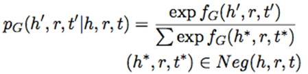 概率分布的计算使用以下公式,f_G(h, r, t)为生成器的scorefunction: