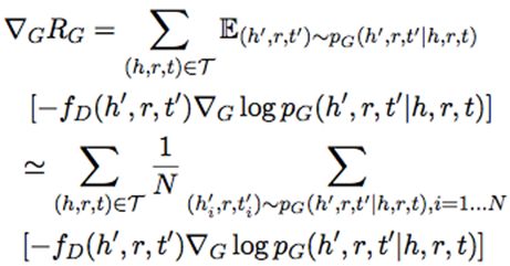 由于 R_G 是一个离散采样步骤得不到梯度,本文借鉴了其他论文提到的梯度策略理论获取梯度进行优化【这一部分论文把这个过程对标到强化学习,认为生成器是agent,判别器是environment, (h, r, t) 是 state,负样本概率分布 P_G 是policy,(h’, r, t’)是action,-f_D(h’, r, t’)是reward,认为是 one-step RL 是在每个 epoch,actions 不会影响 state,但每个 action 后会重新从一个不相关的state开始;为减小算法方差而不引入新参数,作者从 reward 减掉一个常量】