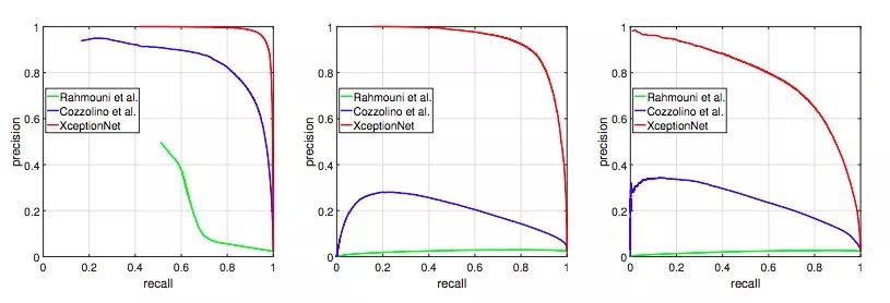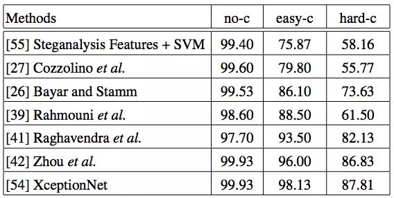 可以发现,在无压缩情况下,所有模型都表现良好,而随着视频清晰度的下降,它们的准确率也都出现了不同程度的下降,其中较浅的CNN表现尤为明显,而XceptionNet CNN总体表现优秀。事实上,这种下降是可以接受的,因为一旦视频变得很模糊,人眼也无法作出准确的区分。