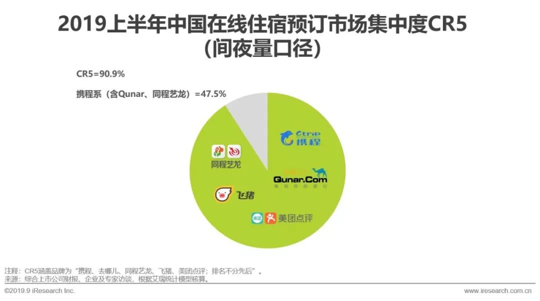 •间夜量口径下,中国在线住宿预订市场CR5为90.9%