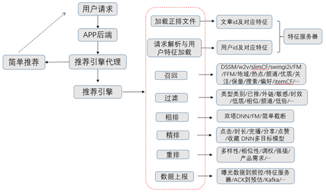 推荐引擎在推荐系统当中起到类似于一个调度器的作用,用户的请求从APP后端发往推荐引擎,推荐引擎调用各种服务,比如召回服务和排序服务,然后按照规则对各种服务返回的结果进行处理,最后将处理好的TopK内容返回给用户。以信息流推荐系统为例,典型的推荐引擎架构如下: