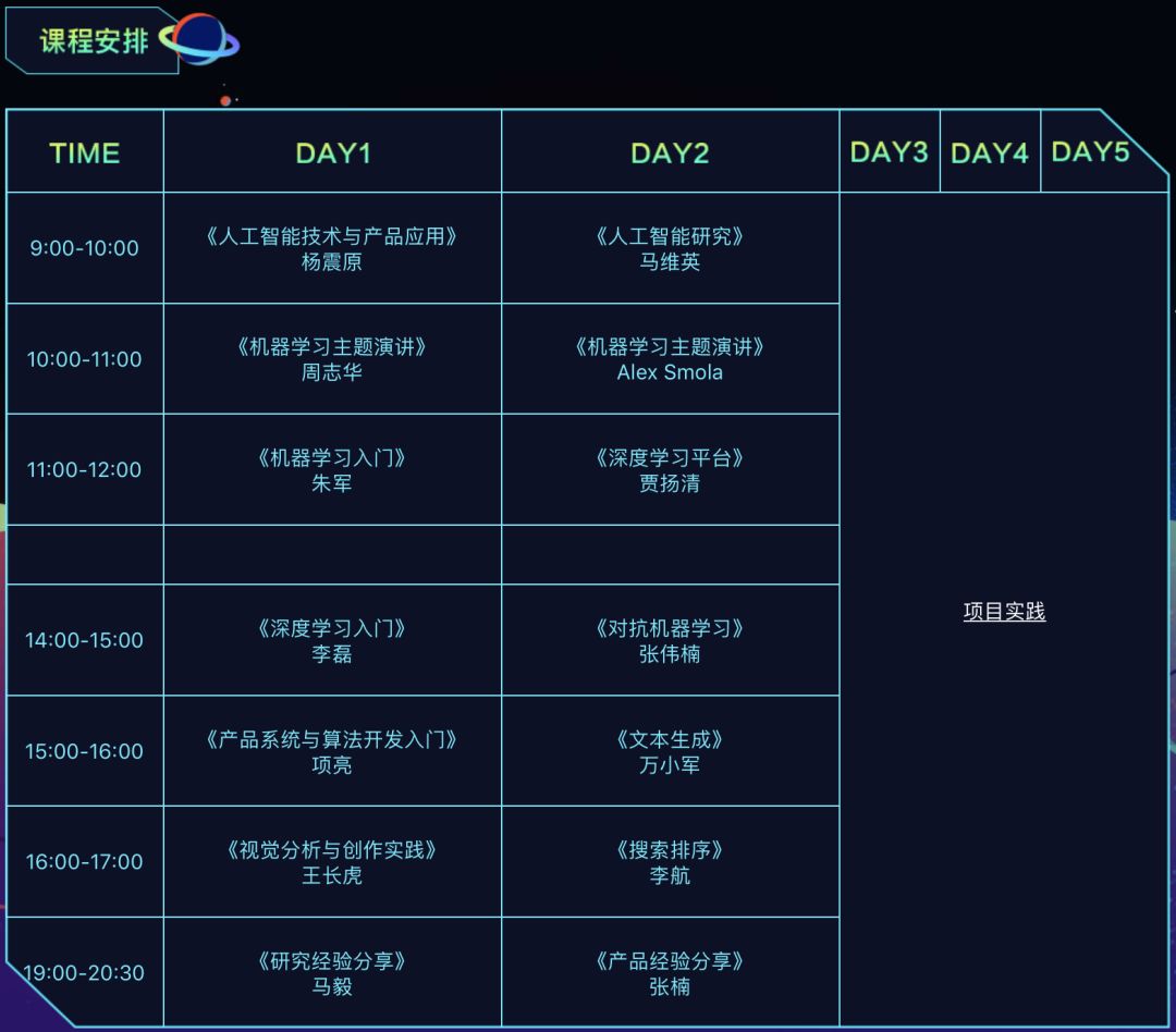 在课程安排上,Bytedance AI Camp 采用 2 天知识课+3 天项目实战课+0.5 天项目展示的方式,既覆盖了理论学习又包括项目实践。