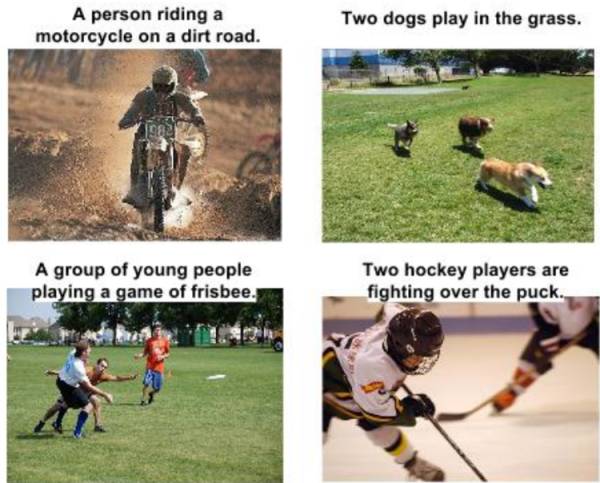 图像标注是一项引人注目的研究领域,它的研究目的是给出一张图片,你给我用一段文字描述它,如图中所示,图片中第一个图,程序自动给出的描述是“一个人在尘土飞扬的土路上骑摩托车”,第二个图片是“两只狗在草地上玩耍”。由于该研究巨大的商业价值(例如图片搜索),近几年,工业界的百度,谷歌和微软 以及学术界的加大伯克利,深度学习研究重地多伦多大学都在做相应的研究。 图5.图像标注,根据图片生成描述文字