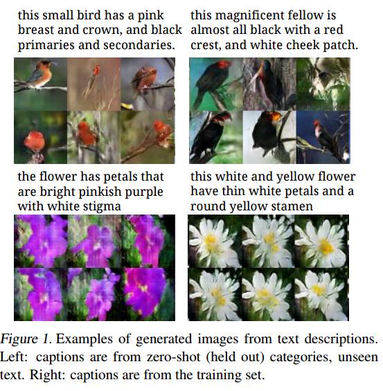 生成对抗网络一般是根据随机噪声来生成特定类型的图像等实例,条件生成对抗网络则是根据一定的输入来限定输出,例如根据几个描述名词来生成特定的实例,这有点类似1.5节介绍的由文字生成图像,下图是Conditioanal Generative Adversarial Nets论文中的一张图片,根据特定的名词描述来生成图片。(注意:左边的一列图片的描述文字是训练集中不存在的,也就是说是模型根据没有见过的描述来生成的图片,右边的一列图片的描述是训练集中存在的) 图10. 根据文字来生成图片