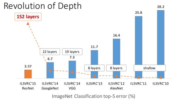 自从Alex和他的导师Hinton(深度学习鼻祖)在2012年的ImageNet大规模图像识别竞赛(ILSVRC2012)中以超过第二名10个百分点的成绩(83.6%的Top5精度)碾压第二名(74.2%,使用传统的计算机视觉方法)后,深度学习真正开始火热,卷积神经网络(CNN)开始成为家喻户晓的名字,从12年的AlexNet(83.6%),到2013年ImageNet 大规模图像识别竞赛冠军的88.8%,再到2014年VGG的92.7%和同年的GoogLeNet的93.3%,终于,到了2015年,在1000类的图像识别中,微软提出的残差网(ResNet)以96.43%的Top5正确率,达到了超过人类的水平(人类的正确率也只有94.9%).