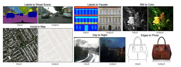 条件生成对抗网络的另一篇有意思的论文是图像到图像的翻译,该论文提出的模型能够根据一张输入图片,然后给出模型生成的图片,下图是论文中的一张图,其中左上角第一对非常有意思,模型输入图像分割的结果,给出了生成的真实场景的结果,这类似于图像分割的反向工程。 图11. 根据特定输入来生成一些有意思的输出图片