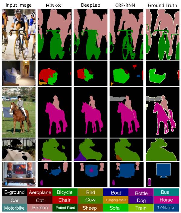 图像分割也是一项有意思的研究领域,它的目的是把图像中各种不同物体给用不同颜色分割出来,如下图所示,其平均精度(mIoU,即预测区域和实际区域交集除以预测区域和实际区域的并集),也从最开始的FCN模型(图像语义分割全连接网络,该论文获得计算机视觉顶会CVPR2015的最佳论文的)的62.2%,到DeepLab框架的72.7%,再到牛津大学的CRF as RNN的74.7%。该领域是一个仍在进展的领域,仍旧有很大的进步空间。 图4. 图像分割的例子