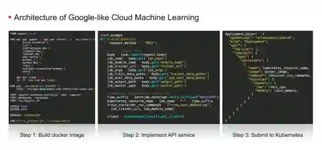 最后,需要实现机器学习场景下的 API 服务。针对机器学习的模型开发、模型训练和模型服务三个主要流程,我们可以定义提交训练任务、创建开发环境、启动模型服务、提交离线预测任务等 API,用熟悉的编程语言来实现 Web service 接口。要实现一个 Google-like 的云深度学习平台,大家可以参考下面这三个步骤。