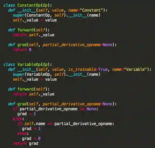 那么对于常量(ConstantOp)和变量(VariableOp),他们的正向运算就是得到的是本身的值,而求导时常量的导数为 0,求偏导的变量导数为 1,其他变量也为 0,具体代码如下。