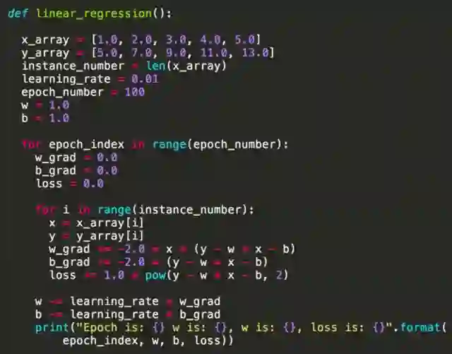 下面是一个最简单的线性回归 Python 实现,模型是简单的 y = w * x + b。