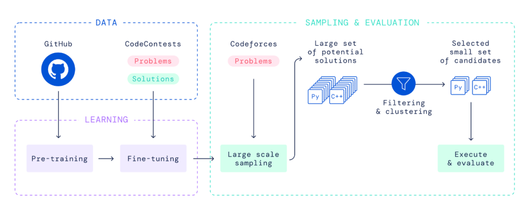 研究者在选定的公共 GitHub 代码上预训练该模型,并在相对较小的竞赛编程数据集上对其进行微调。在评估期间,研究者为每个问题创建了大量的 C++ 和 Python 程序,且数量级比以前的工作要大。然后对这些解决方案进行筛选、聚类和重新排序,将这些解决方案分配到一个由 10 个候选程序组成的小集合中,并提交给外部评估。这个自动化系统取代了竞争对手的调试、编译、通过测试和最终提交的反复试验过程。
