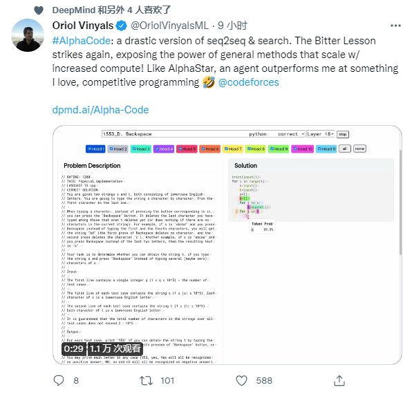 如有 AI 研究科学家发系列长推表示,AlphaCode 达到人类水平还需要几年时间,它在 codeforce 上的排名是有限制的,如许多参与者是高中生或大学生;还有就是 AlphaCode 生成的绝大多数程序都是错误的,正是使用示例测试进行过滤才使得 AlphaCode 实际解决了某些问题。