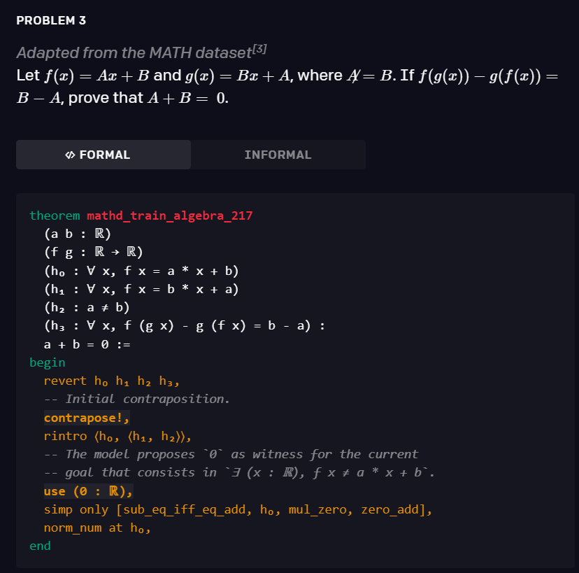 该证明器使用一个语言模型来寻找形式化命题(formal statement)的证明。每次发现一个新的证明,研究者就把它作为新的训练数据,这改善了神经网络,使它能够在迭代中找到越来越难的命题的解决方案。