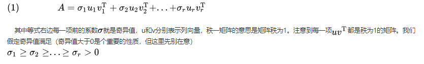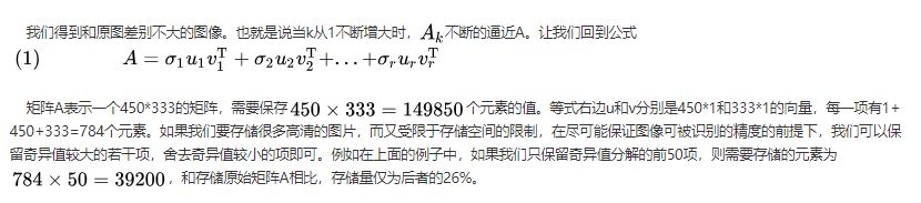 我们都知道,图片实际上对应着一个矩阵,矩阵的大小就是像素大小,比如这张图对应的矩阵阶数就是450*333,矩阵上每个元素的数值对应着像素值。我们记这个像素矩阵为A 现在我们对矩阵A进行奇异值分解。直观上,奇异值分解将矩阵分解成若干个秩一矩阵之和,用公式表示就是: