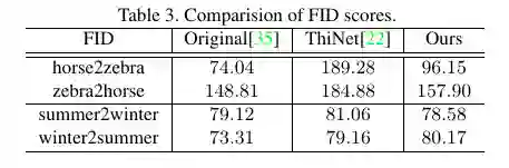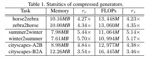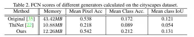 在 cityscapes 数据集采用 FCN 分数,horse2zebra 和 summer2winter 数据集采用 FID 分数,论文提出方法结果与压缩之前的模型接近,远远好于传统的剪枝方法。