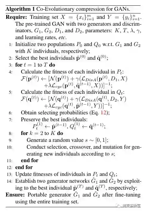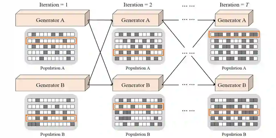 维持一个种群,也可以通过进化算法选出适应值最优的个体。但是,通过公式 8 可以看出,循环一致性误差计算同时涉及两个生成器,所以同时对