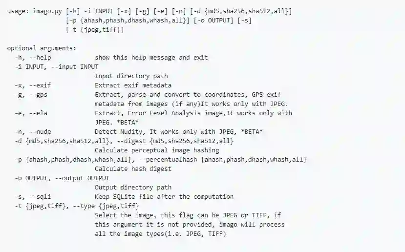 唯一必需的参数是-i,它是imago将从中开始搜索图像文件的基本目录。您还应提供至少一种类型的提取(即exif,data,gps,digest)。