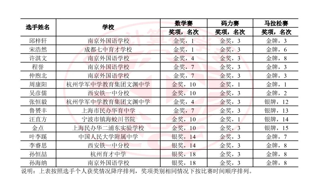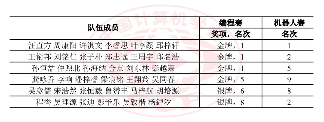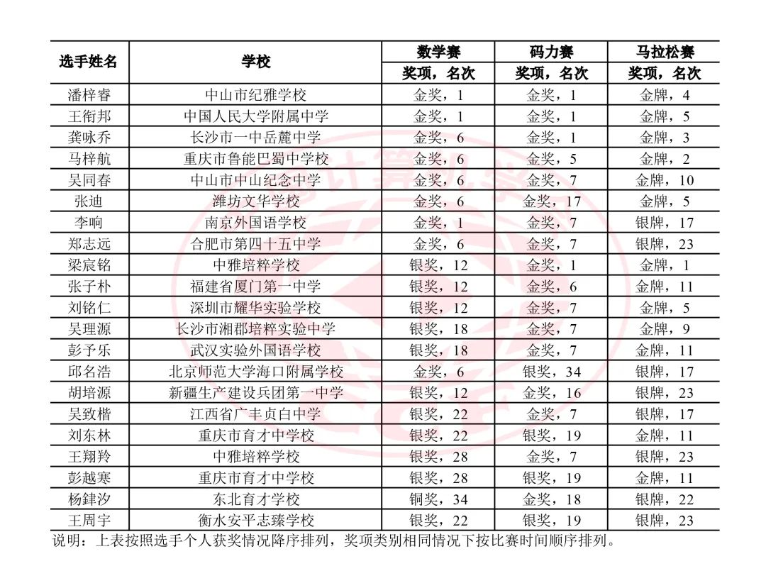 中国队共有15名选手报名线上A组,21名选手报名线上B组。选手们经过努力拼搏,在4场比赛中均发挥出色:在数学赛中获20金15银1铜;在码力赛中获32金4银;在马拉松赛中获24金12银;在团体赛中获4金2银,总成绩位居所有参赛队伍之首!