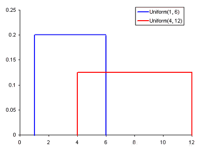 均匀分布是其中最基本的概率分布方式。它有一个只出现在一定范围内的值,而在该范围之外的都是0。我们也可以把它考虑为是一个具有两个分类的变量:0或另一个值。分类变量可能具有除0之外的多个值,但我们仍然可以将其可视化为多个均匀分布的分段函数;