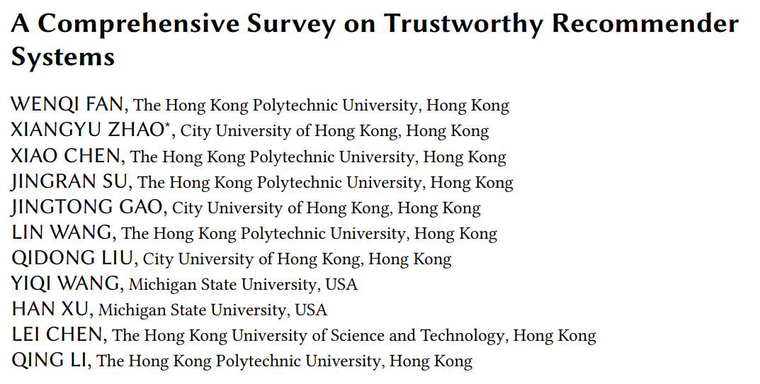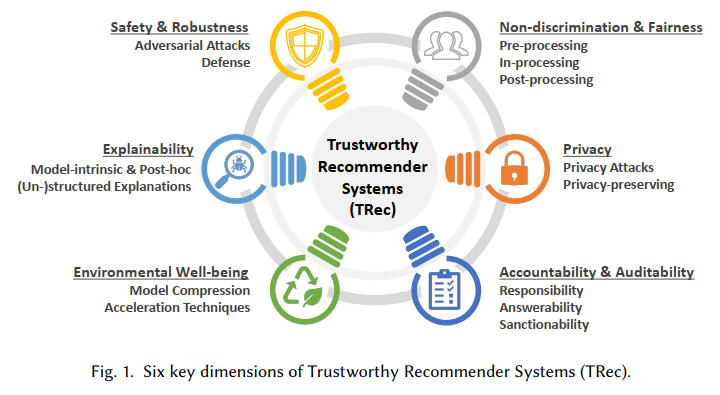 在本文所介绍的综述中,其对可信推荐系统(TRec)进行了全面的概述,并特别关注六个最重要的方面;即安全和鲁棒性、非歧视和公平性、可解释性、隐私性、环境友好以及问责与审计。对于每个方面,其总结了最近的相关技术,并讨论了潜在的研究方向,以帮助实现真正的可信推荐系统。