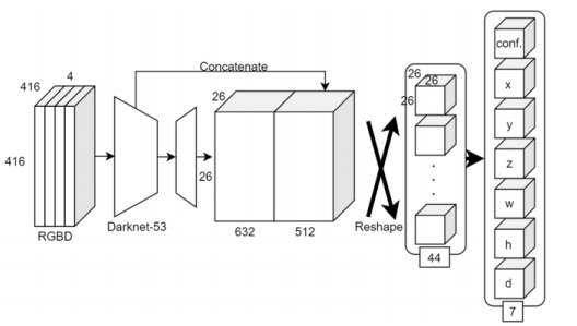 YOLOv3的变种,构建了一个轻量级的目标检测器,从RGBD-D立体摄像机输入深度和彩色图像。该模型的处理速度为44.35fps(GPU: NVIDIA RTX 2080 and CPU: Intel Core i7 8700K)。