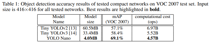 YOLO Nano 比 Tiny YOLOv2 和 Tiny YOLOv3更小,更快,mAP更高!模型仅4.0MB。在 NVIDIA Jetson Xavier上速度竟高达26.9~48.2 FPS!