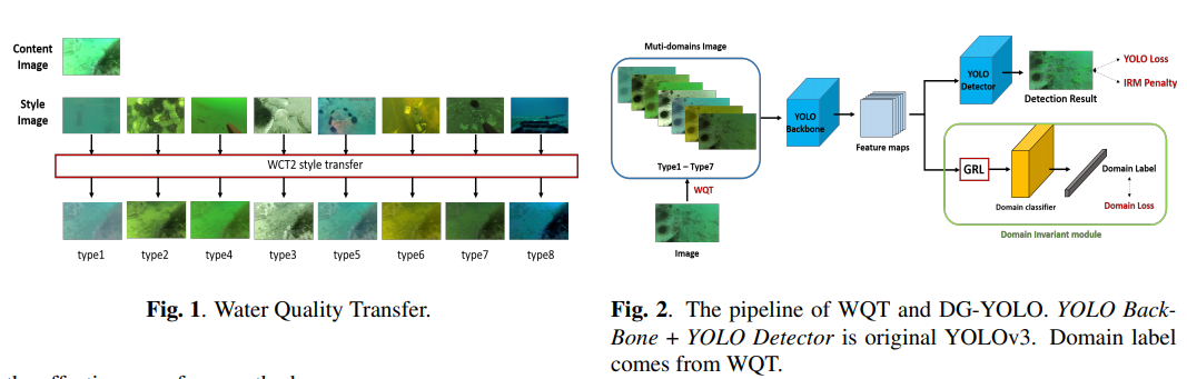 该工作旨在研究水下目标检测数据,因为水下目标的数据比较少,提出了新的水质迁移的数据增广方法和YOLO新变种:DG-YOLO ,该算法由 YOLOv3, DIM 和 IRM penalty 组成。