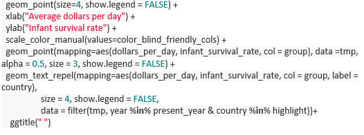 第一张图是地区平均值;撒哈拉以南非洲国家的数值,你可以看到一个平均值被分成数个不同的数值;第三张是所有国家的情况。我标出了一些(与本地区相比)变化较大的国家,并且用了色盲也能识别的颜色。这里的代码有些复杂,原因是我不得不对Gapminder数据进行预处理。