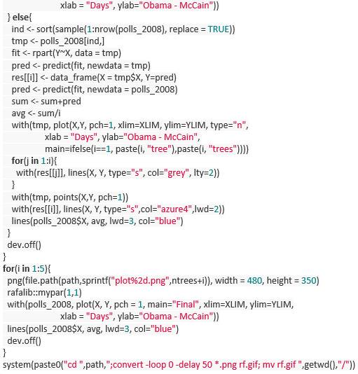 在过去的很长一段时间里,我都觉得很难理解为何随机森林作为一种基于树的算法,却能够产生平滑的预测。这里的gif图帮助我理解了原因。我用的是2008年总统选举的数据库,因为我认为该数据的趋势总体是平滑的,但是有几个尖锐的边,就连局部加权回归散点平滑法都很难预测。需要注意的是,我们只有一个影响因素,这个gif并不能展示出随机森林的另一个重要特点:随机的特征选取可以减少树与树之间的相关程度。