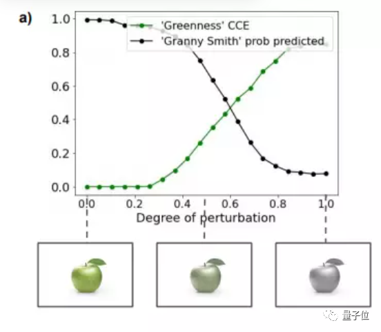 改变苹果图片的颜色(使图片变灰),分类模型识别错误的概率增大时(黑线),CCE辨别出“绿色”为伪相关的分数也就越高(绿线)。