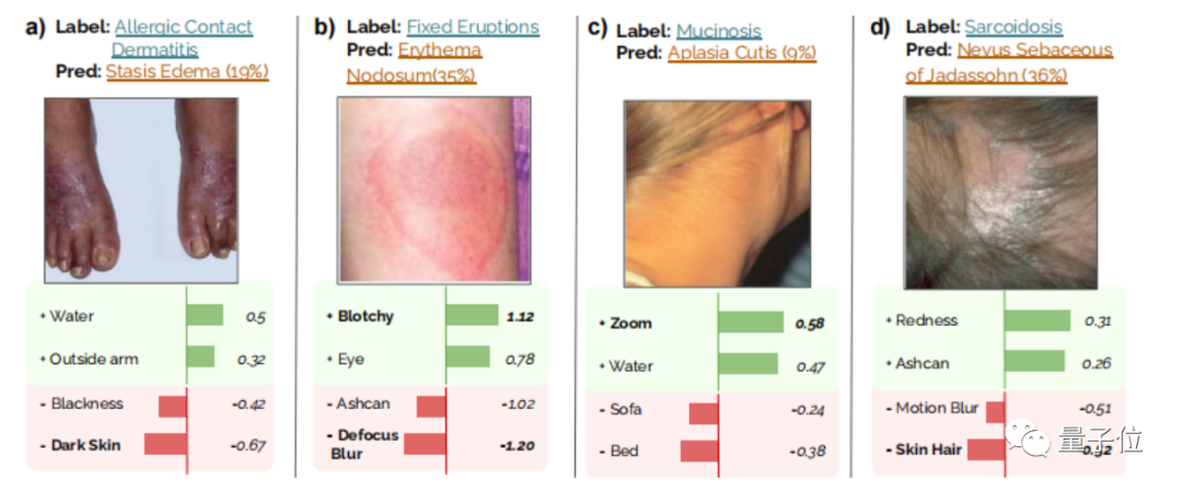 CCE使用学习到的偏差和图像质量条件来解释模型犯错,也已被专业的皮肤科医生证实——这些因素,确实很大程度上是导致皮肤图像难以分类的原因。