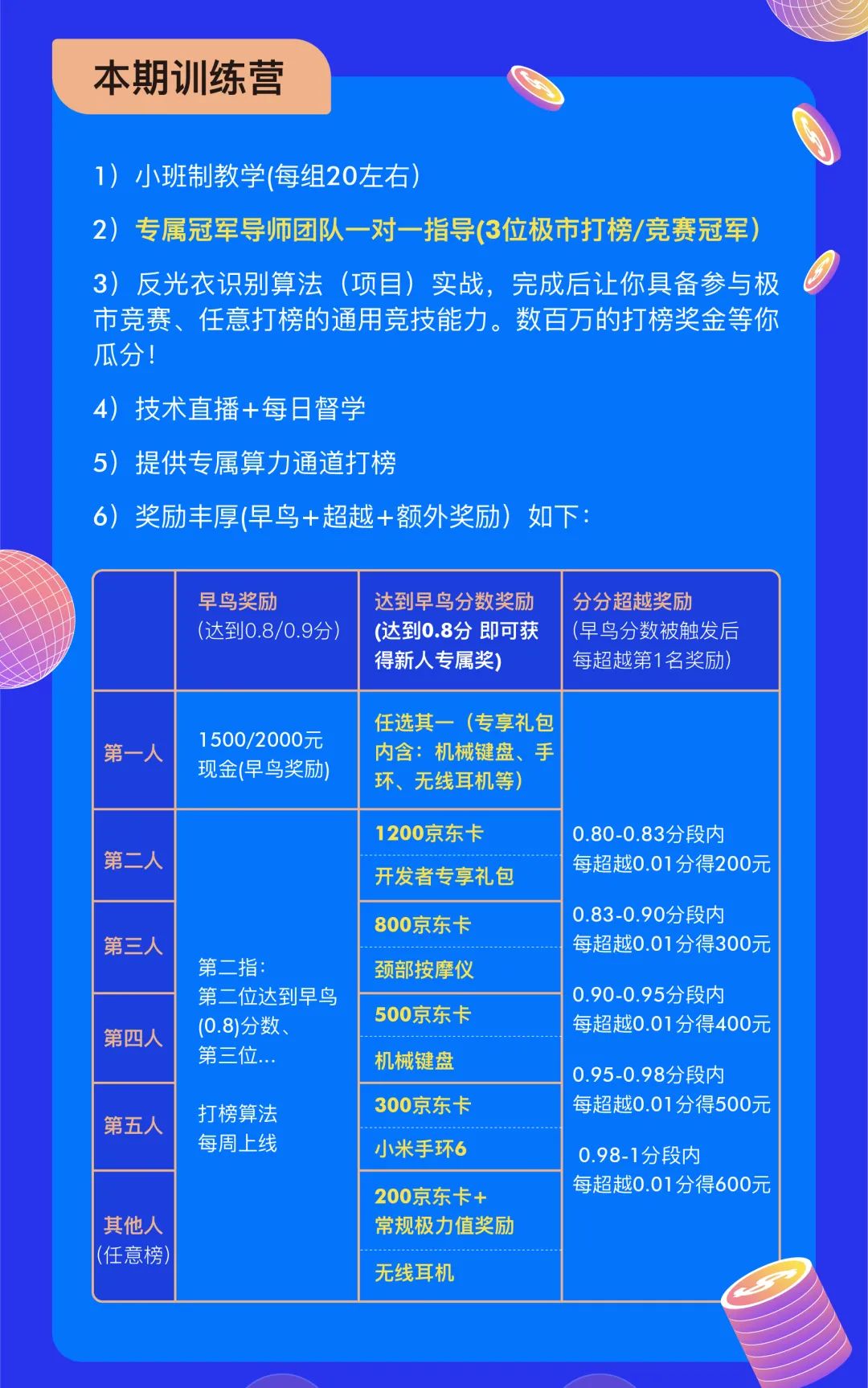 极市打榜是面向计算机视觉开发者的算法竞技,参与者人人都可以通过提高算法分数获得早鸟奖励(0.7/0.8/0.9)+分分超越奖励(每超越第一名0.01分),排行榜前三名的胜利者将有机会获得该算法的极市复购订单,获得持续的订单收益。打榜算法每周上新!