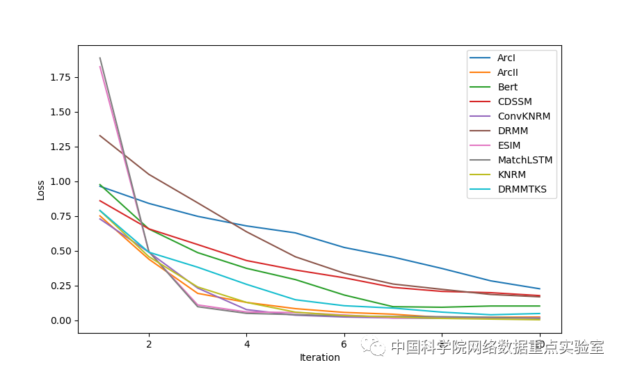 我们对比了多个模型,不同模型的性能如下所示,图 1 为不同模型在 WikiQA 训练数据集上的损失曲线,图 2 为不同模型在 WikiQA 测试数据集上的 NDCG@5 性能曲线,可以看到, MatchZoo-Py 可以复现 Keras 版本的性能,并且发现 Bert 取得了最好的性能。