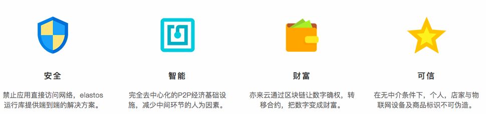 亦来云在操作系统中融入区块链技术,并区块链及智能合约、Elastos Carrier、Elastos Runtime、Elastos SDK等四个层次打造“可信记账+可信计算+可信应用环境”的物联网+区块链网端操作系统。