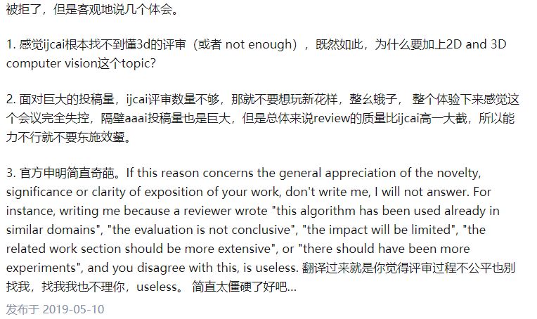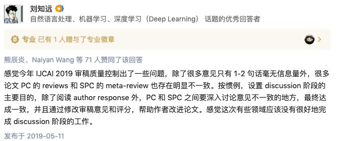 清华大学副教授、博士生导师刘知远老师也参与了知乎上的讨论,认为“感觉今年IJCAI 2019审稿质量控制出了一些问题……有些领域应该没有很好地完成discussion阶段的工作。”