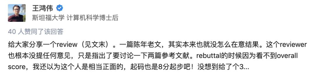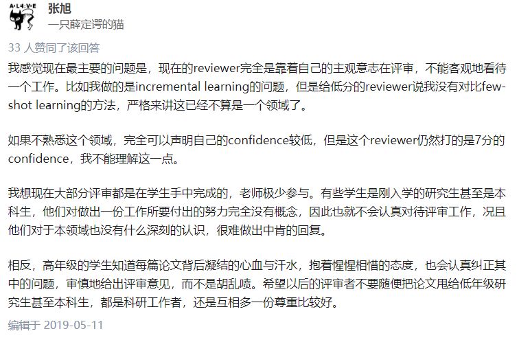 微软亚洲研究院实习生,知乎ID:“张旭”表示:审稿人不熟悉所在领域,大量刚刚入门的学生参与评审并给出意见,无论从能力和态度上都没有体现出对原作者的尊重,如果审稿人对论文的领域不熟悉,不应该硬着头皮强行给出审稿意见。