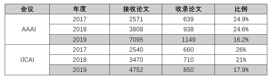 近3年AAAI和IJCAI会议的投稿量和录取比率