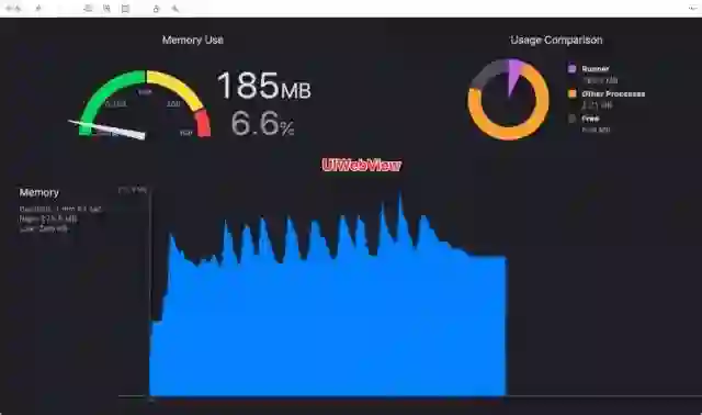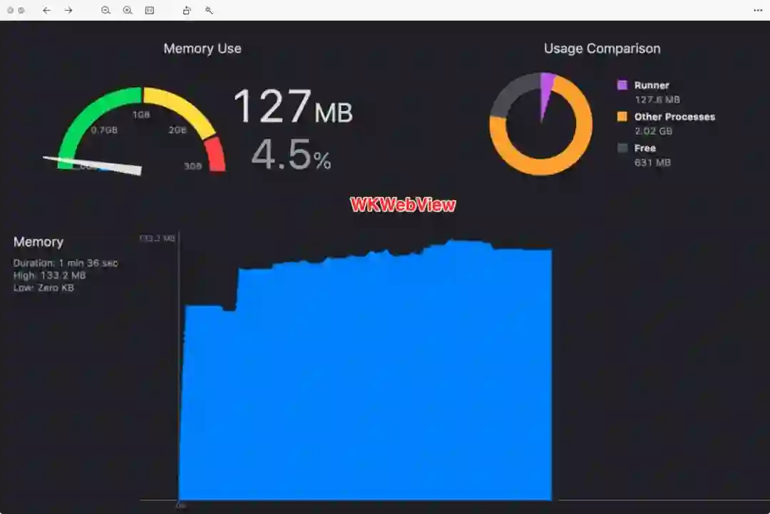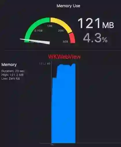 他相比较原生 WKWebView 的内存开销稍大一点,从测试表现来看,一般大个 30 MB 左右。