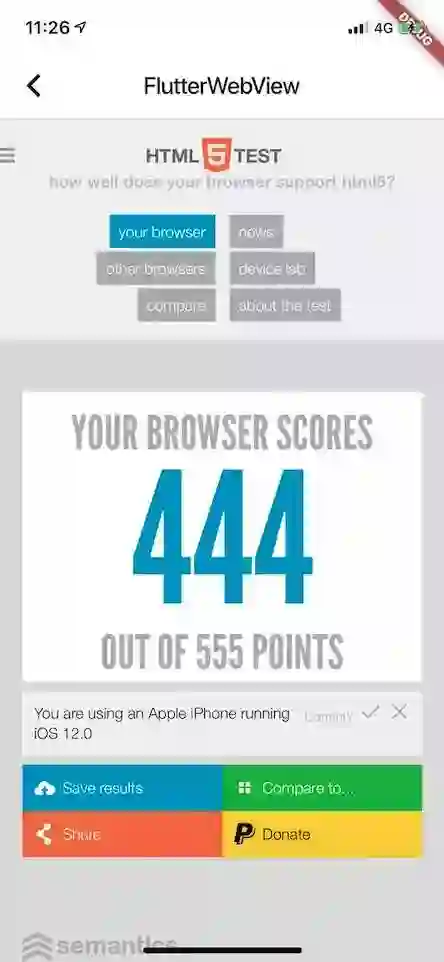因为 flutter 里使用的就是 WK,所以和原生的 WKWebView 一样都是 444 分,比 UIWebView 的 437 略胜一筹。