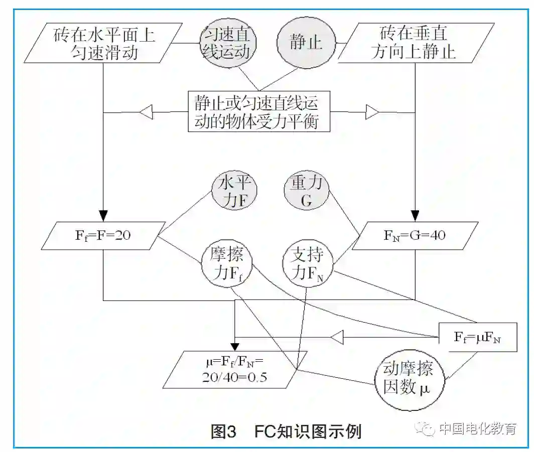 FC知识(Fact & Case)是以学习活动为中心的教学设计理论强调的一个知识类别。题目、任务、项目、现象都属于FC知识,FC知识图是某个FC知识所包含的知识点以及这些知识点之间在该FC知识的情境下所形成的特定关联图和推理路径(如图3所示)。FC知识图库的基础是题库。如果将所有的问题都标注了FC知识图,这个题库就成了FC知识图库。当然FC知识图库中不仅仅包含问题,还包括现象、任务、项目等其他类别的FC知识。
