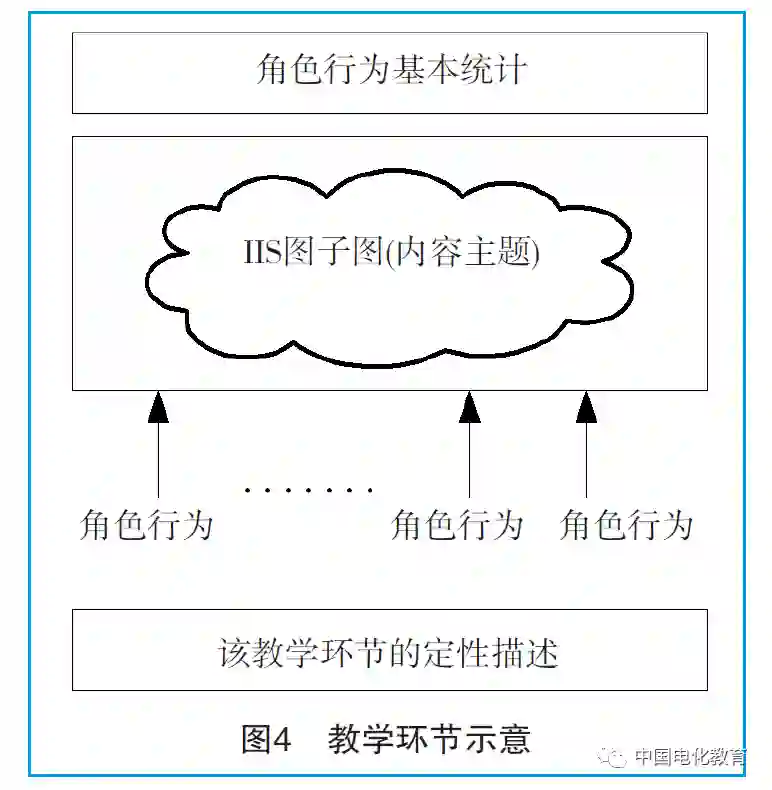如果我们按照IIS图分析法将教学过程切分为相互呼应的信息流(某些种类的信息流具有知识建模图属性,这个属性说明了该信息流所包含的知识内容)和师生行为序列,再按照特定规范将一组连续的信息流序列进行合并,就产生了教学环节(其最基本的属性是教学主题图,它是这个教学环节的主要内容,如图4所示),再对这个环节标注相应的师生行为和描述信息,我们便获得一个教学环节图。一个教学过程就是教学环节图的有向无环图,这个有向无环图就是这个教学过程的教学过程机制图。教学过程机制图是真实教学活动的中观真相。通过读图,我们便可以知晓教学中观层次的事实,这对于解释某些教学中的现象和理解教育系统的具体表现提供了数据依据。每一次教学过程都可以表征为一个教学过程机制图,一门课程的所有教学过程的教学过程机制图组合起来,在经过某种合并并标注特定的信息(比如时间、物质资源、角色、人力资源、权力、资本,等等)便可以得到课程实施的过程机制图,以此类推我们便可以获得教育系统的过程机制图。在某种程度上说,过程机制图库存放的是历史上发生的教育过程,有图有真相。孤立的过程机制图的应用价值还不明显。但过程机制图不但可以用来描述运行态教育系统,也可以用来描述设计态教育系统。教育系统的设计态过程机制图与运行态过程机制图的差异是极为重要的信息,这种差异可以告诉我们教育系统的哪些设计要素并没有变成现实而成为多余的设计,教育系统的哪些设计导致了适应性变差,现实中的哪些额外的事件、信息可以吸收到设计态教育系统之中,这种差异又说明了从教者专业能力的哪些缺陷,等等。