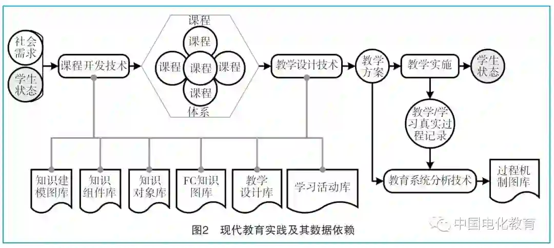 任何领域的现代化都意味着这个领域核心过程的技术化。教育现代化并不意味着课堂教学应用现代装备或者采用所谓的现代教学方法模式。教育实践的核心过程不是课堂教学,而是课前的课程开发、教学设计以及课后的教育系统分析。只有运用新教育学提供的课程开发技术、教学设计技术、教育系统分析技术将这些教育核心过程技术化,我们才能实现教育现代化。现代教育是数据驱动的,教育现代化需要的数据储备包括知识对象库、知识建模图库、知识组件库、FC知识图库、学习活动库、教学设计库、过程机制图库,等等。现代教育同时需要一种由政府、学校、课程生产商等多种主体组成的行政与市场相混合的交往关系,并且需要专业教师以教育众筹的方式参与教育系统生存期管理。