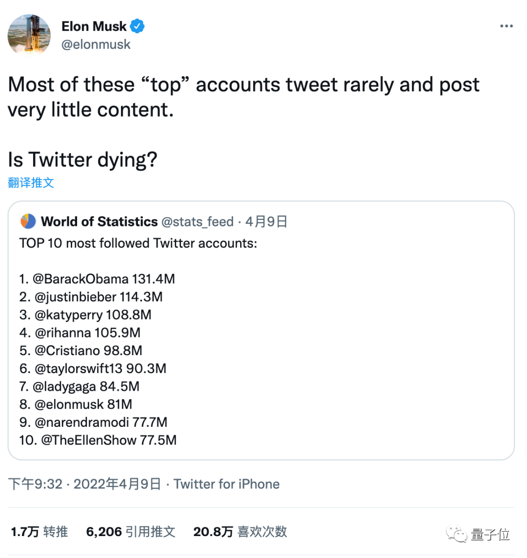 4月9日,马斯克公开发问“推特粉丝最多的十个账户中大部分都已经不活跃了, 推特这是要凉凉了吗?”