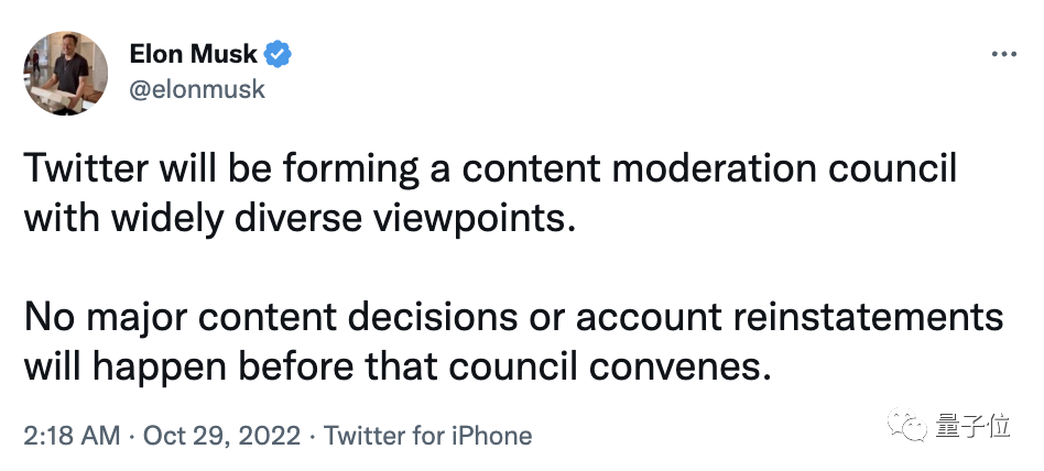 马斯克在推特上提议,组建一个内容审核委员会,即在理事会召开会议之前,不会做出重大的内容决定或账户修复。