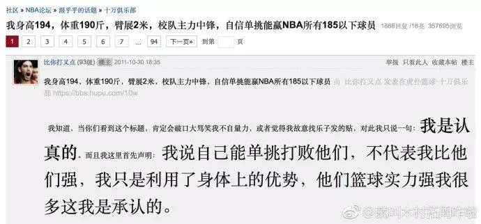 这是虎扑一个史诗级别的神贴,标题叫《我单挑能赢NBA所有185cm以下的球员》,作者 ID是 “比你打又点”,人称“比哥”的虎扑用户。