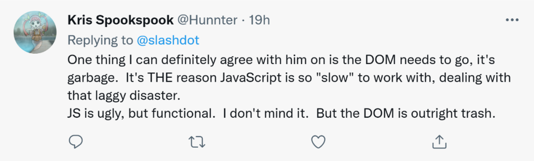 。DOM 是 JavaScript 运行慢的罪魁祸首。JS 是不太美观,但很实用。所以,我不介意。再次强调,DOM 才是彻头彻尾的垃圾。」