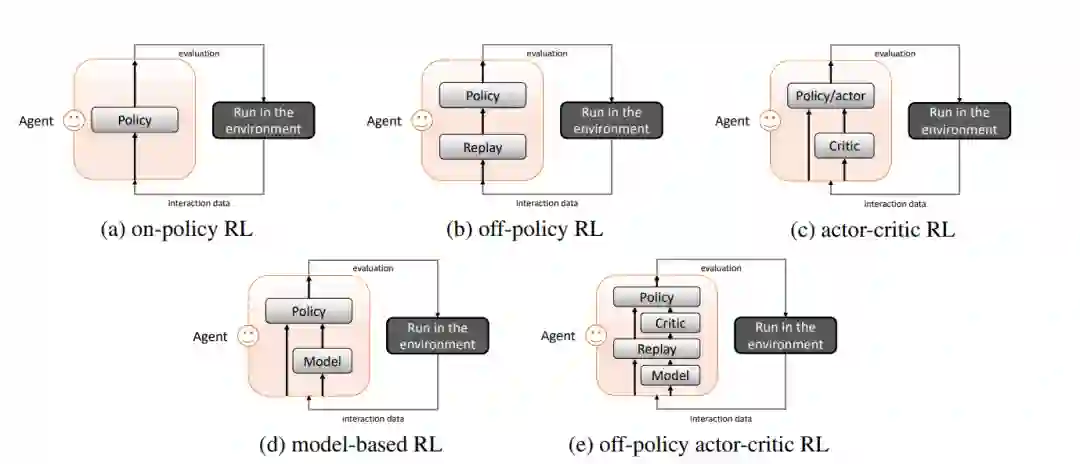 有了环境模型,智能体就有了想象的能力。它可以与模型进行交互,以便对交互数据进行采样,也称为仿真数据。理想情况下,如果模型足够准确,可以在模型中学习到一个好的策略。与无模型强化学习(model-free reinforcement learning, MFRL)方法相比,智能体只能使用从与真实环境的交互中采样的数据,称为经验数据,MBRL方法使智能体能够充分利用学习模型中的经验数据。值得注意的是,除了MBRL,还有其他一些方法试图更好地利用经验数据,如off-policy算法(使用重放缓冲区记录旧数据)和actor-critic算法(通过学习评论家来促进策略更新)。图1描述了不同类型的RL结构。图1(a)是最简单的on-policy RL,其中智能体使用最新的数据来更新策略。在off-policy中,如图1(b)所示,代理在重放缓冲区中收集历史数据,在重放缓冲区中学习策略。在行动者-评论者RL中,如1(c)所示,智能体学习评论者,其是长期回报的价值函数,然后学习批评者辅助的策略(行动者)。如图1(d)所示,MBRL显式地学习一个模型。与策略外RL相比,MBRL重构了状态转移的动态过程,而策略外RL只是简单地使用重放缓冲区来更稳健地估计值。虽然价值函数或批评的计算涉及到转移动力学的信息,但MBRL中的学习模型与策略解耦,因此可以用于评估其他策略,而价值函数与抽样策略绑定。此外,请注意,非策略、演员-评论者和基于模型是三个并行的结构,图1(e)显示了它们的可能组合。