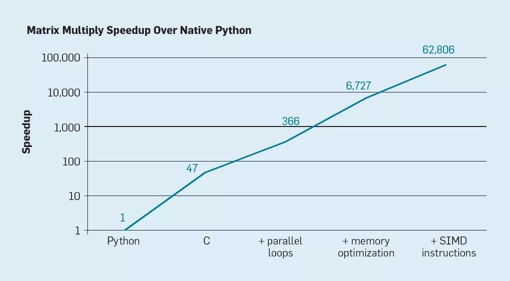 首先,目前软件普遍由具有动态类型和存储管理的高级语言编写,它们的可解释性和执行效率十分低下。例如用 C 语言重写 Python 代码,就可以将矩阵相乘运算的性能提升 47 倍,如果再引入并行循环处理,内存优化以及单指令多数据并行化操作,那么运算执行速度可达 Python 版本的 62000 多倍。这说明,高级语言与传统语言存在巨大差距,前者注重程序员的编程效率,后者更注重程序性能。