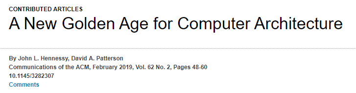 在最新一期的 ACM 通讯上(2019 年 2 月刊),2017 年图灵奖获得者 John L. Hennessy 和 David A. Patterson 共同发表了一篇名为《计算机架构的新黄金时代》的文章,这是两人对图灵奖演讲的总结归纳和升华。